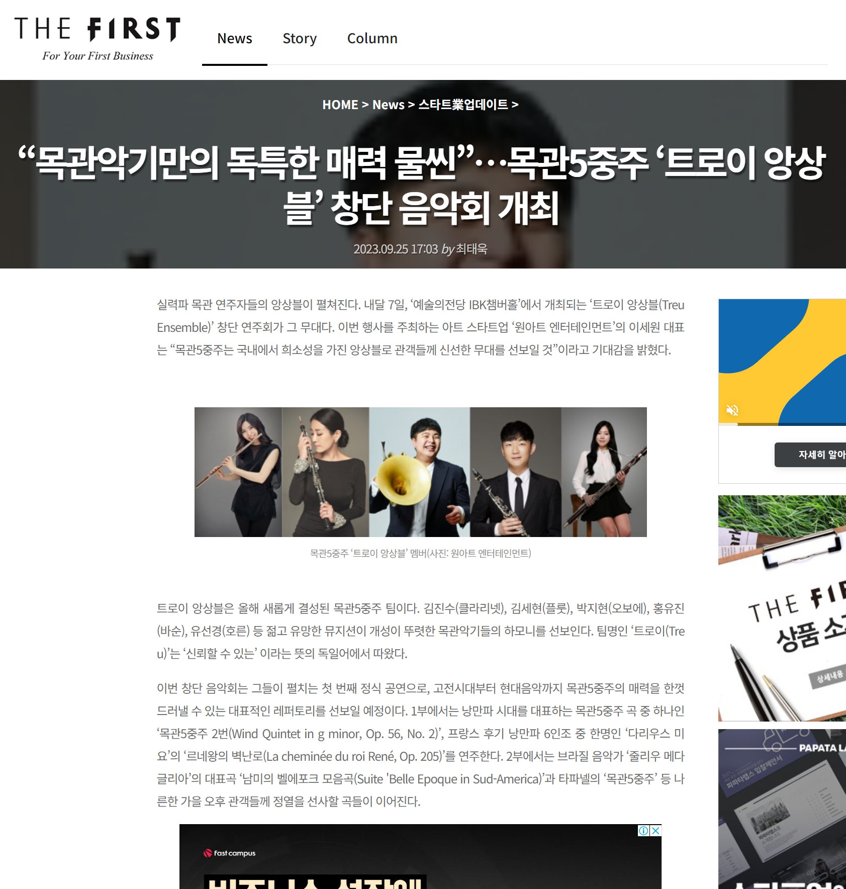 실력파 목관 연주자들의 앙상블이 펼쳐진다. 내달 7일, ‘예술의전당 IBK챔버홀’에서 개최되는 ‘트로이 앙상블(Treu Ensemble)’ 창단 연주회가 그 무대다. 이번 행사를 주최하는 아트 스타트업 ‘원아트 엔터테인먼트’의 이세원 대표는 “목관5중주는 국내에서 희소성을 가진 앙상블로 관객들께 신선한 무대를 선보일 것”이라고 기대감을 밝혔다.