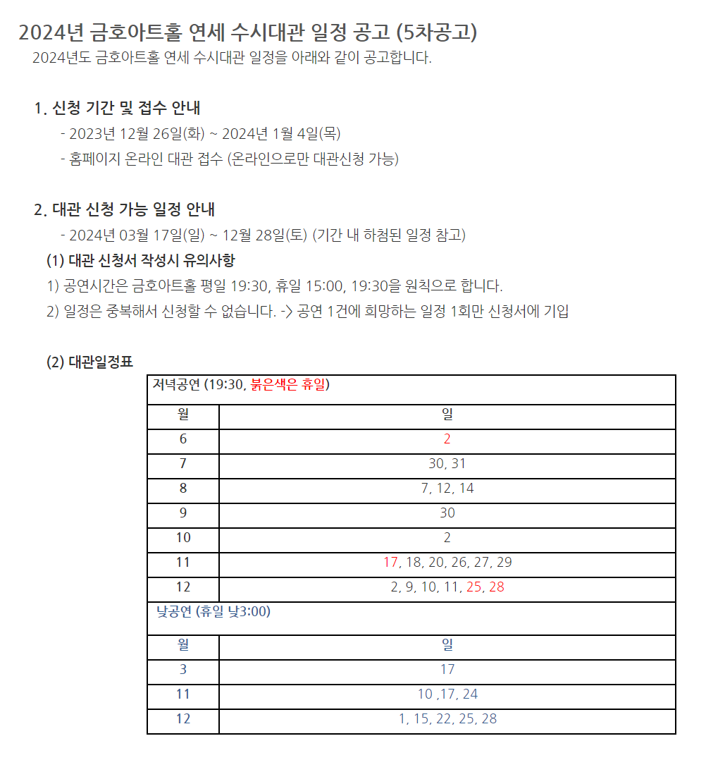 ▶금호아트홀 연세 2024년 5차 수시대관 공고 ◀