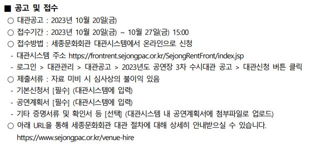 ▶세종문화회관 2024년 2차 수시대관 공고 ◀